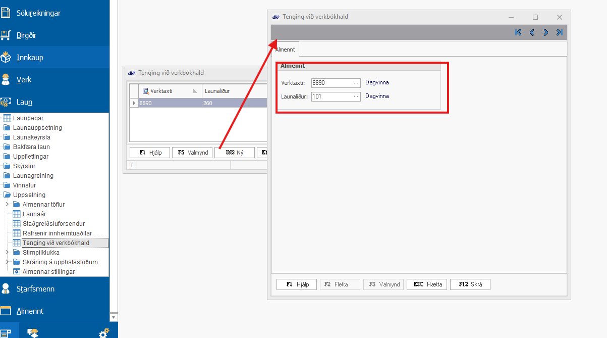 Farið er í Laun - Uppsetning - Tenging við verkbókhald.