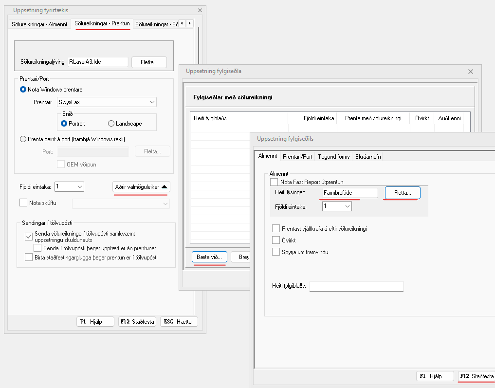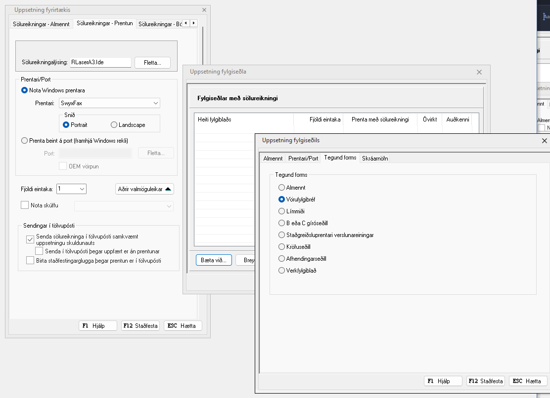 Staðfestingargluggi - Afhendingarseðill Ef þið viljið fjarlægja þennan glugga þegar er prentað reikning: Þá er farið undir Sölureikningar > Uppsetning > Almennar stillingar > Sölureikningar - Prentun > Aðrir valmöguleikar > Aðrir fylgiseðlar > ...