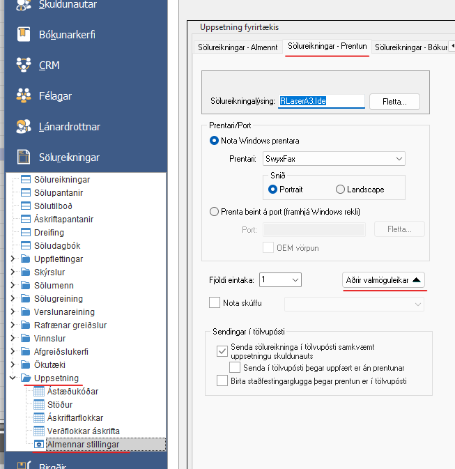 Aðrir sölureikningar / Auðkenni lýsingar Ef skuldunautur/ar eiga að vera með sérprentlýsingu frekar en almenna prentlýsingu þarf að byrja að fara í Sölureikningar > Uppsetning > Almennar stillingar > flipinn "Sölureikningar - Prentun" > smella á ...