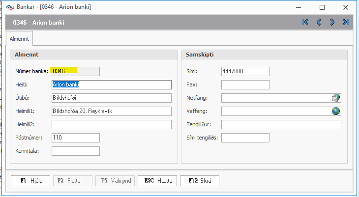 Hægt er að stofna bankann undir Almennt > Almennar töflur > Bankar > INS og setja upplýsingar um bankann inn, PASSA að skrá bankanúmerið með 4 tölustöfum.
