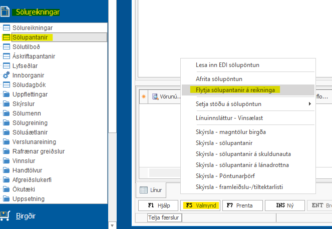 Sölureikningar > Sölupantanir > F5 Valmynd > Flytja sölupantanir á reikninga