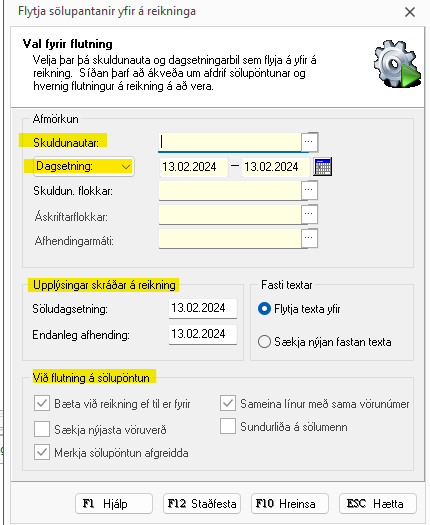 Hér er sett inn skuldunaut, dagsetningarbil, afdrif sölupöntunar og hvernig flutningur á reikning á að vera.