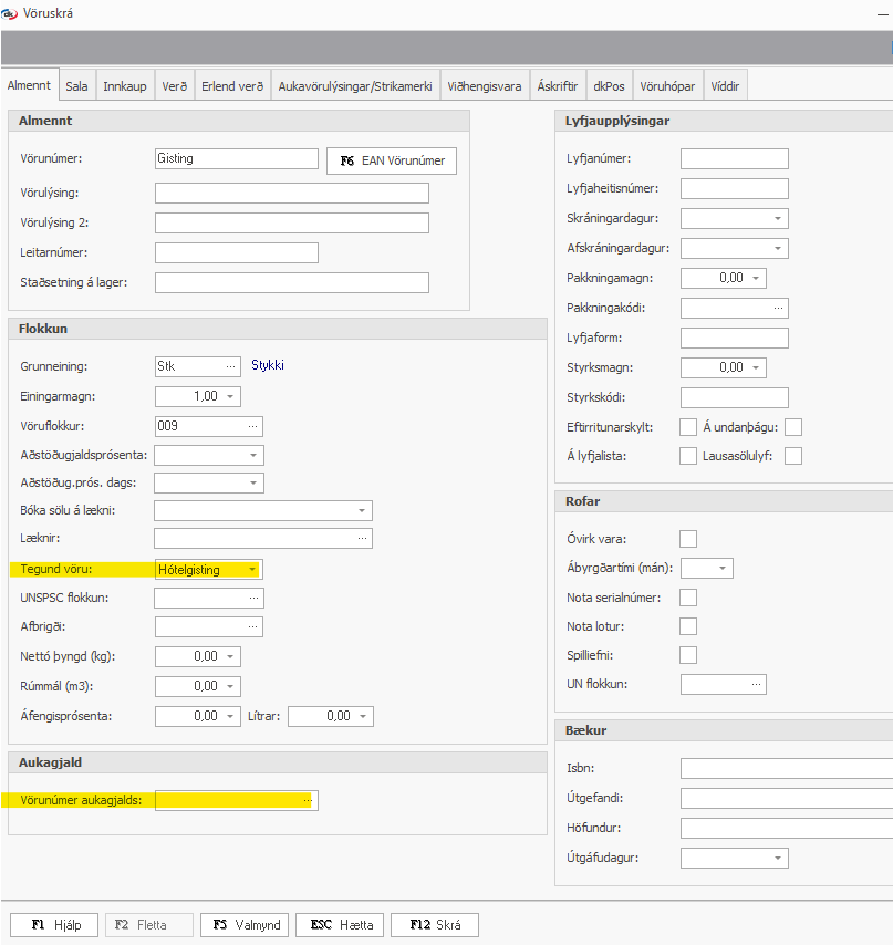 Vörurnar fyrir gistingu þurfa síðan að vera merktar í Tegund vöru sem Hótelgisting og svo er varan fyrir gistináttaskatt tengd sem aukavara við gistinguna. Á vöruspjaldinu er Aukagjald og þar er varan fyrir gistináttaskatt sett inn, sjá á mynd hér fyrir neðan.