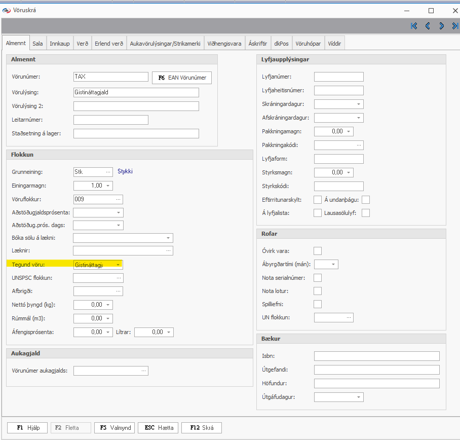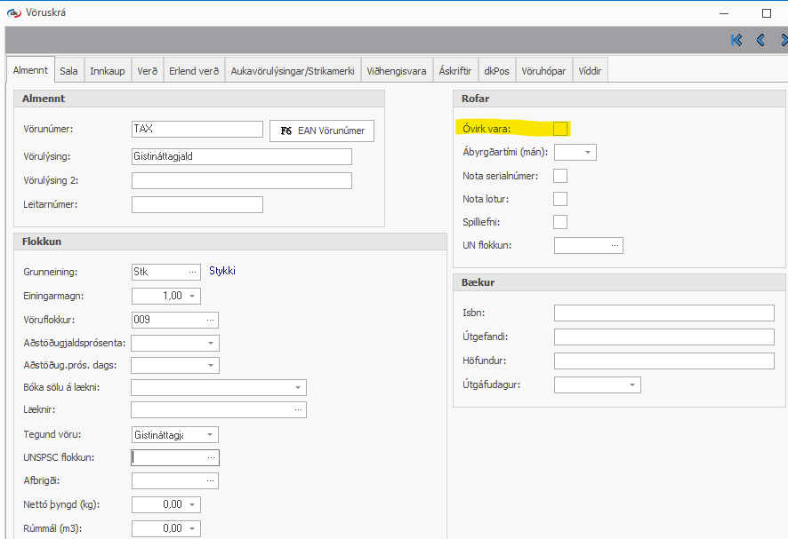 Athugið að ef gistináttaskattur hefur áður verið settur upp í kerfinu að þá er hægt að nota þá uppsetningu áfram. Mögulega hefur varan fyrir gistináttaskatt verið óvirkjuð, en þá er hægt að virkja vöruna aftur með því að sýna lokaðar vörur, finna vöruna, opna hana og taka hakið úr "óvirk og vista með F12. Þá er hægt að setja vöruna aftur á önnur vörunúmer fyrir gistingu sem vörunúmer aukagjalds ef það vantar þar.