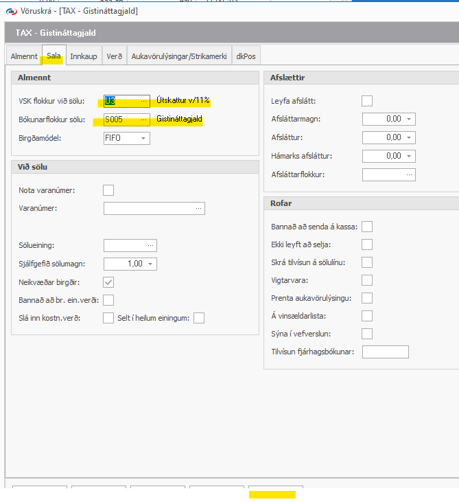 Í birgðakerfi dk eru sérstakar uppsetningar fyrir útreikning á gistináttaskatti.