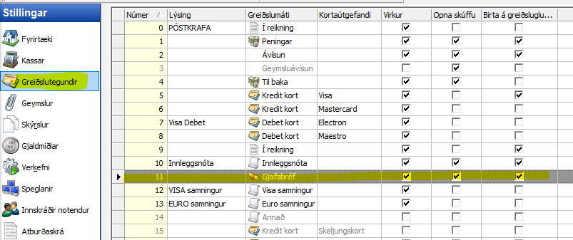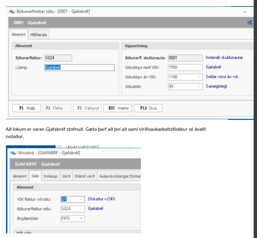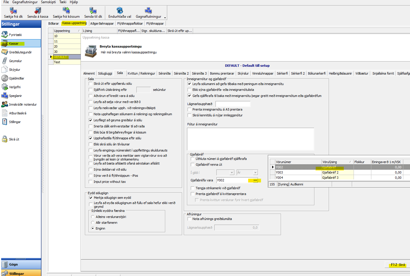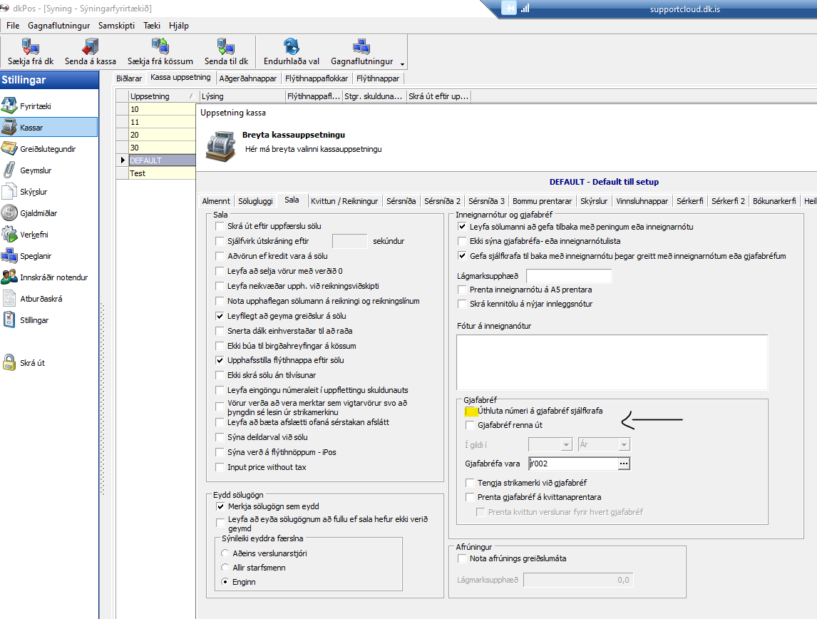 Opna stillingar > kassar > kassa uppsetning > flipinn Sala > setja inn vöruna gjafabréf.