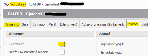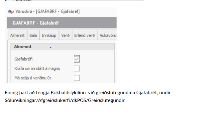Næst er farið í að tengja vöruna ,,Gjafabréf" í birgðum > vörur > opna vöruna > flipinnn dkPos > haka í gjafabréf