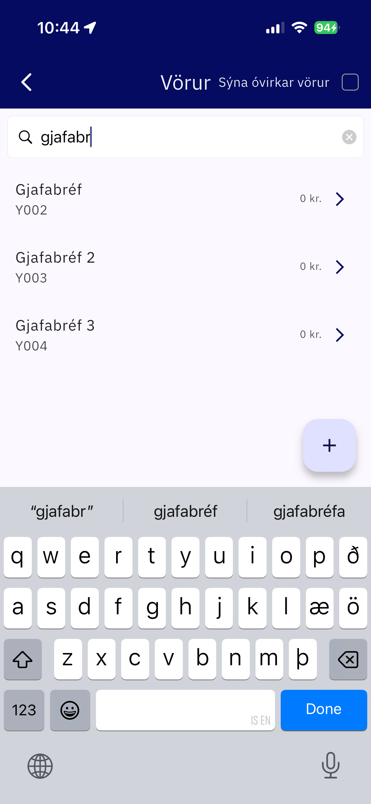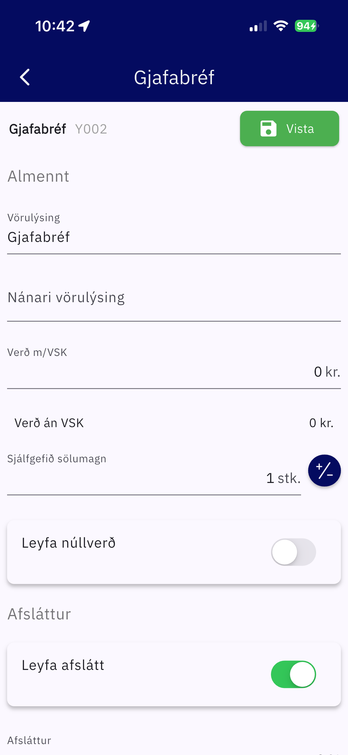 Búa til vöru / stofna vöru sem heitir ,,Gjafabréf" ef hún er ekki til núþegar.