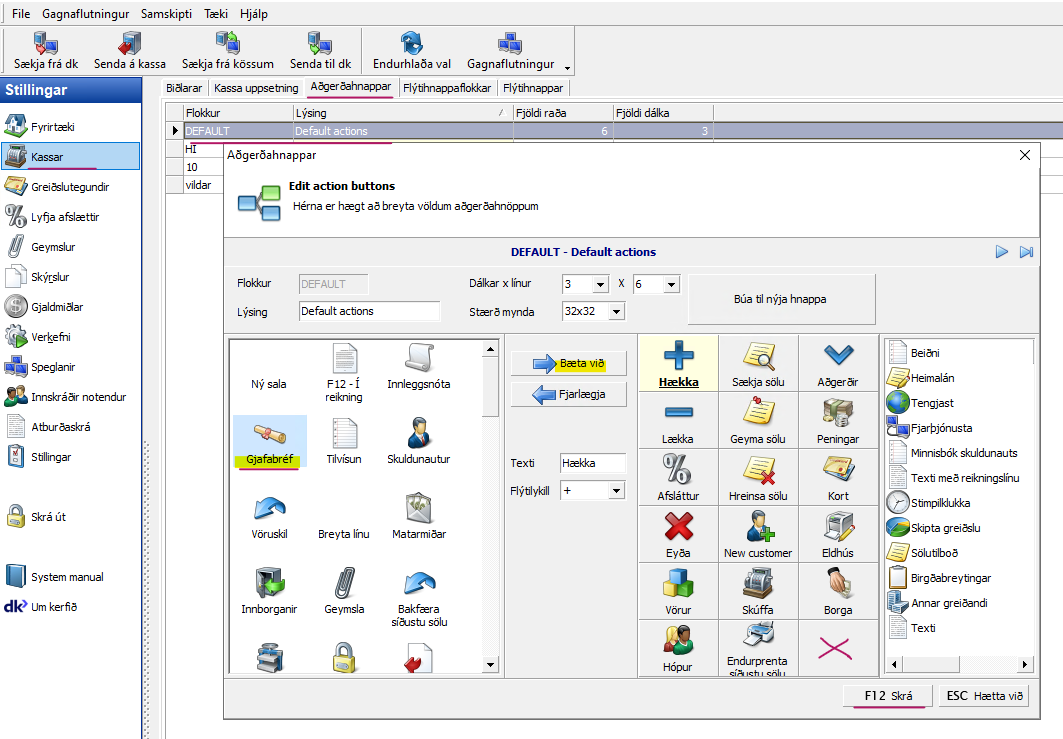 Stillingar > Kassar > Aðgerðarhnappar (flipi 3)