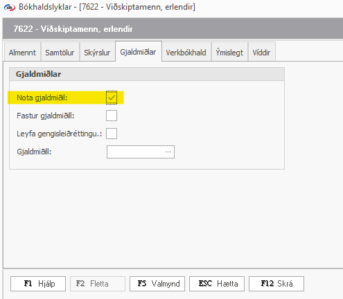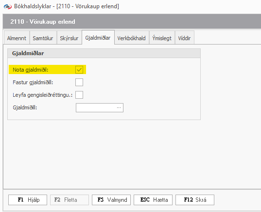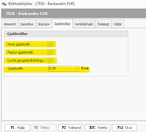 Þegar gjaldmiðlar eru virkjaðir þarf að fara yfir uppsetningu á bókhaldslyklum.