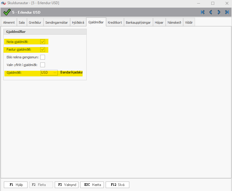 Á efnahagslyklum viljum við hafa sér bókhaldslykil fyrir hvern gjaldmiðil, t.d. á bókhaldslyklum fyrir banka, lán og þess háttar lykla. Það er hakað við að "nota gjaldmiðil", "fastur gjaldmiðill", "leyfa gengisleiðréttingu" og veljum þann gjaldmiðil sem á að vera fastur á viðeigandi bókhaldslykli.