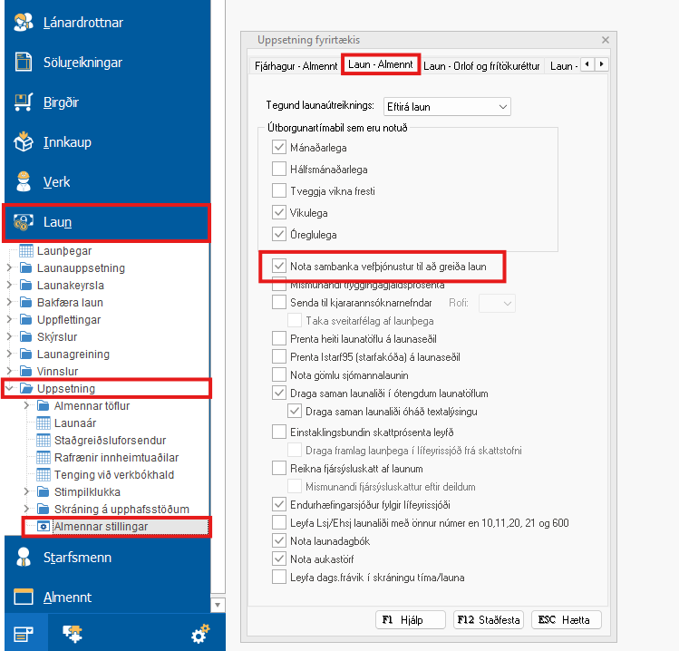 Ef þú ert með sambankavefþjónustur í leyfinu þá er farið í Laun - Uppsetning - Almennar stillingar. Flipinn "Laun-Almennt" er valinn og hakað er í "Nota sambanka vefþjónustur til að greiða laun".