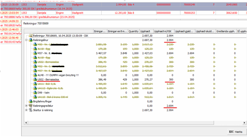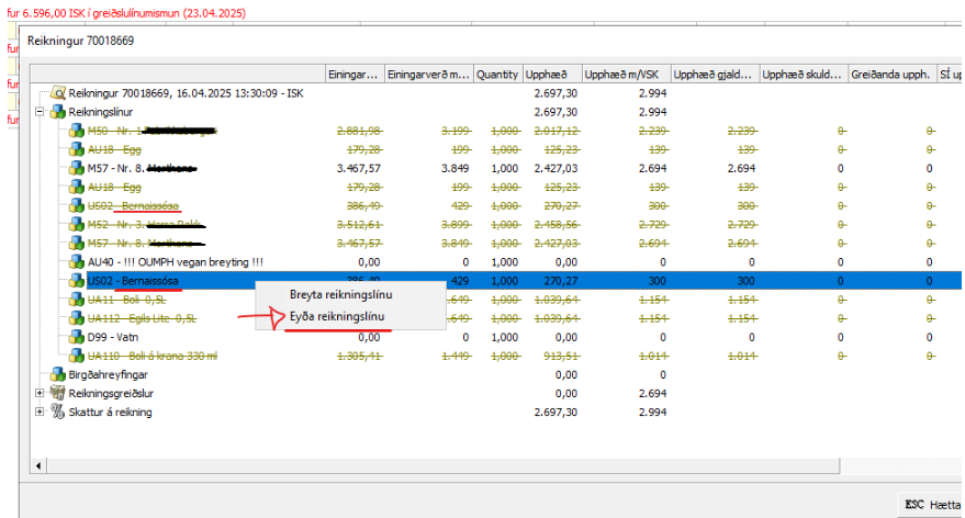 Hægri smella þá og eyða reikningslínunni sem er með mismuninum.