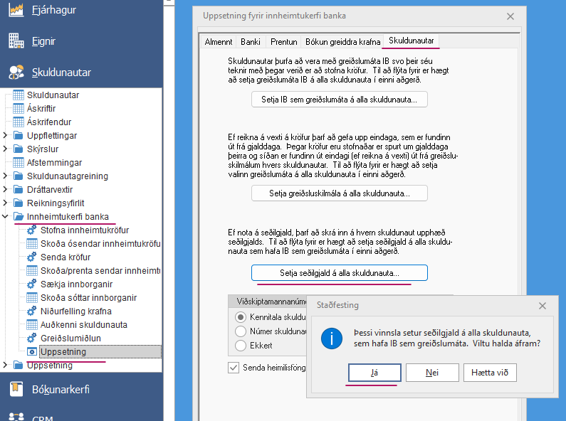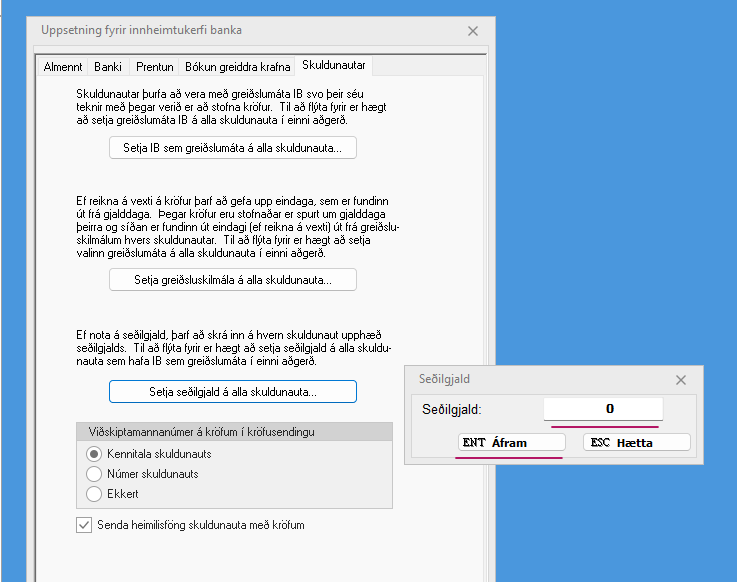 Stofna kröfu við prentun reiknings Hægt er að láta kerfið stofna innheimtukröfu um leið og sölureikningur er uppfærður. Skilyrði Hugbúnaðarskilríki uppsett Sambanka vefþjónustur í leyfi Uppsetning og stillingar Eftirfarandi þarf að vera sett upp og ...