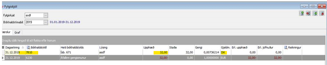 Í dæminu hér að neðan er grunngjaldmiðill félagsins EUR og gengismunurinn 32 EUR. Við ætlum að skrá gengismun fyrir bankareikning sem er færður í erlendri mynt sem í þessu tilviki er ISK. Við setjum því 32 á bankareikninginn þó hann sé ISK. Mótbókunin fer svo á gengismunalykilinn. Það á ekki að slá inn eða breyta gengi hér.
