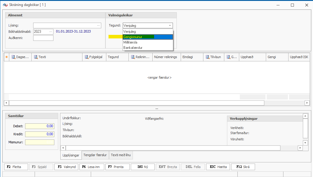 Fjárhagur > Dagbók > INS > Setja "Tegund" dagbókar sem "Gengismunur"