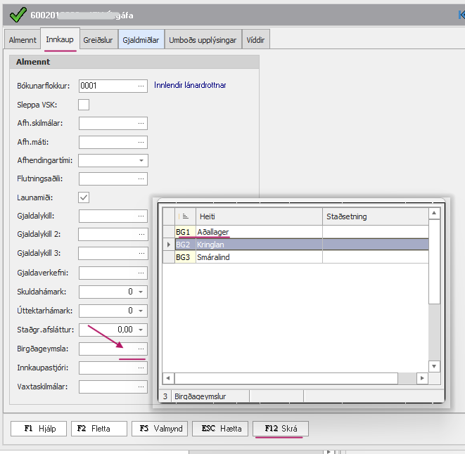 Birgðageymslur Þessi kerfiseining opnar fyrir þann möguleika að vera með lagervörur á mismunandi staðsetningum. Stofna birgðageymslu Til að stofna birgðageymslu er farið í "Birgðir" -> "Uppsetning" -> "Birgðageymslur" Smella á "INS Ný" hnappinn Nýju ...