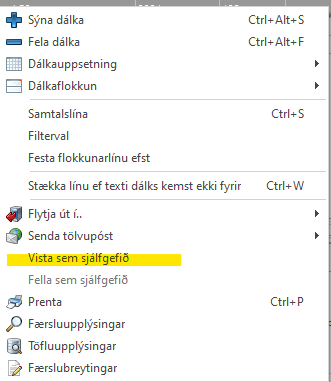 Þessi lánardrottin er svo vistaður (F12). Síðan er línan hans valin þ.a. hún sé grá og hægri smellt með músinni þá opnast gluggi þar sem valið er að þessi skuldunautur/lánardrottin sé sjálfgefinn með því að velja "Vista sem sjálfgefið". Að lokum er línan valin aftur og henni eytt.