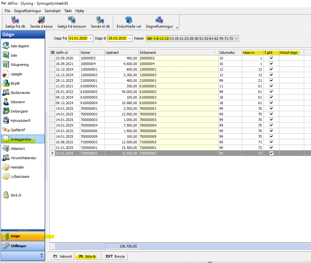 Til að endurvirkja innleggsnótur þá þarf að opna dk bakvinnsluna í hýsingunni (bakendann). Fara í gögn - Innleggsnótur - velja viðeigandi dagsetningartímabil - tvísmella á innleggsnótuna sem á að virkja aftur eða óvirkja og ýta á í gildi - F12 skrá. ...