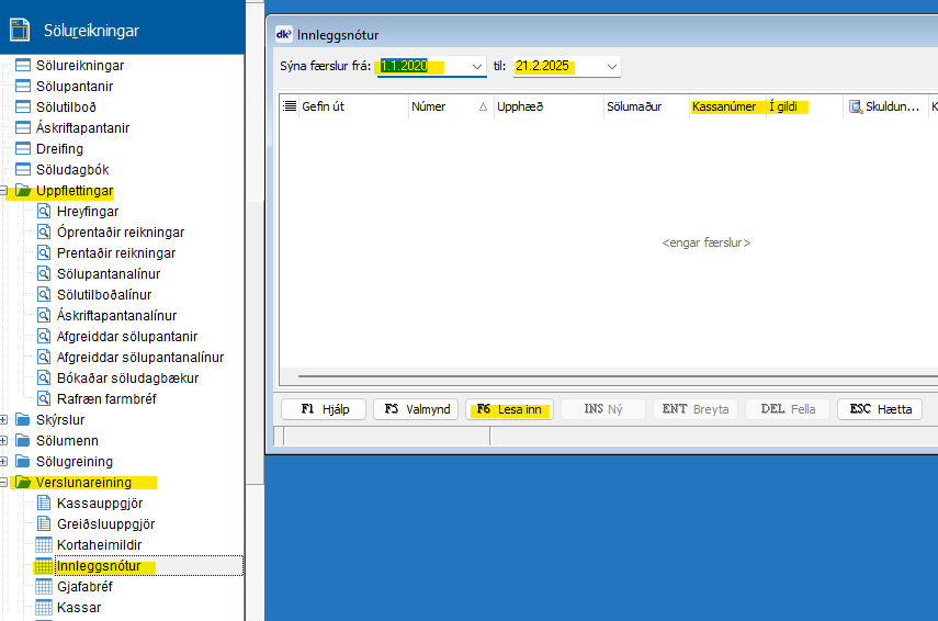 Til þess að skoða innleggsnótur í kerfinu er opnað dkPos bakvinnsluna og leitað eftir eftirfarandi: