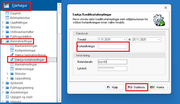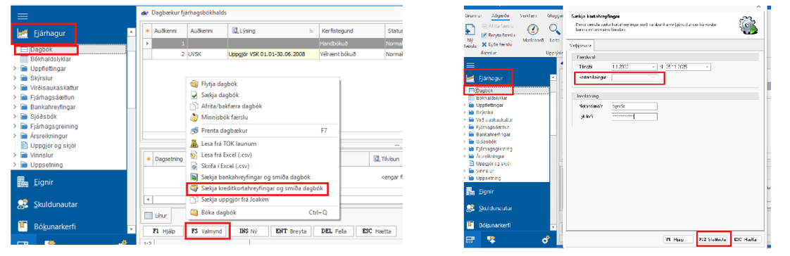 Fjárhagur → Bankareikningar → Sækja kortahreyfingar
