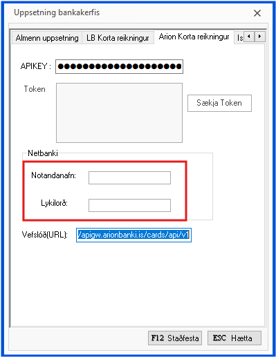 Dálkarnir API Key og Vefslóð (URL) eiga að vera útfylltir