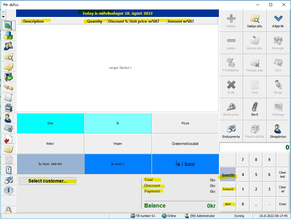 Takkar á ensku í kassakerfi (eða annað tungumál) Til að stilla af og skýra heiti á tökkum með því tungumáli sem viðkomandi vill. To change the language / name of the buttons in the cashier system. Opna bakvinnslu dkPos: - Kassar - Cashier - ...