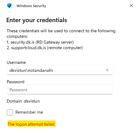 Ef þú færð The Logon attempt failed þýðir það að annaðhvort ertu að nota vitlaust notandanafn eða lykilorð.