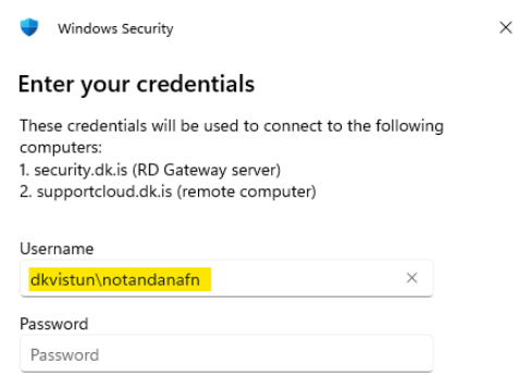 Gakktu úr skugga um að notandanafnið sé slegið inn með dkvistun\ fyrir framan notandanafnið.