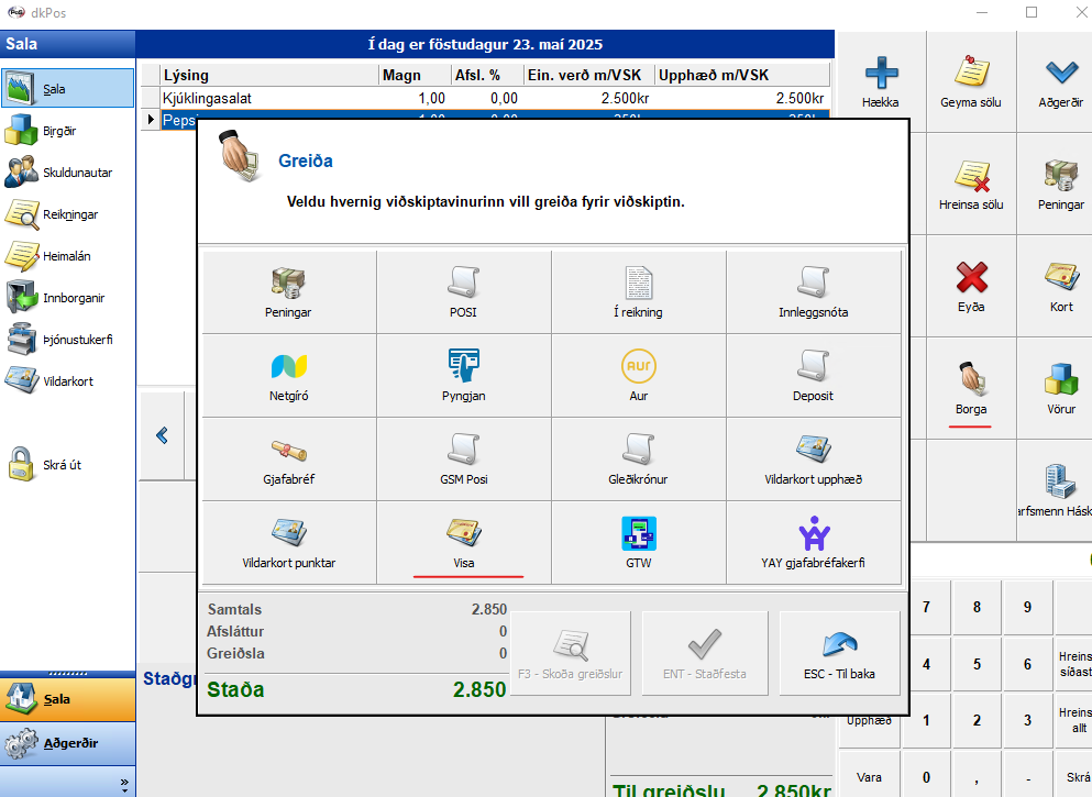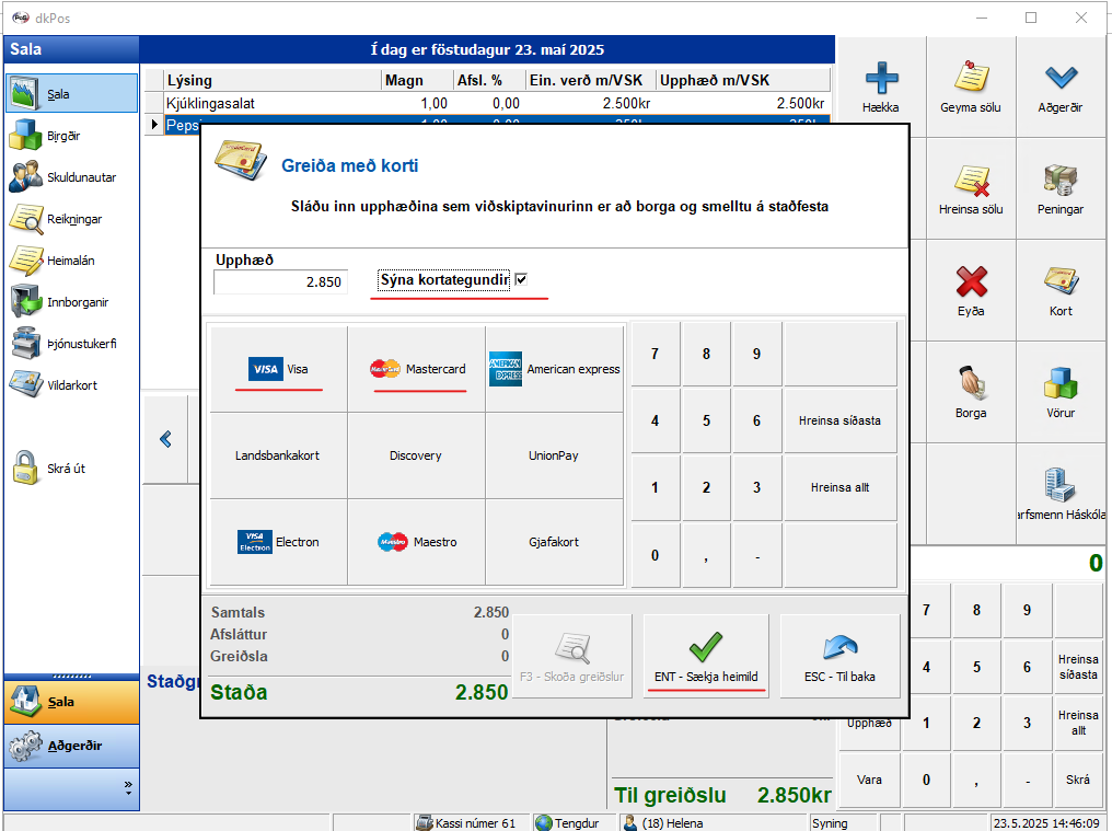 Þegar við veljum sýna kortategundir þá veljum við í kjölfarið rétt kort til að klára færsluna.