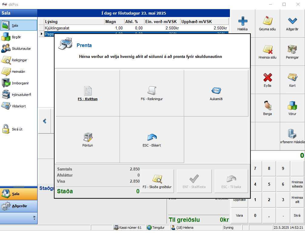 Bakfæra sölu (kreditfæra sölu) Hægt er að bakfæra sölu með því að velja hnappinn [Reikningar ] vinstra megin og finna viðeigandi reikning. Valið svo F5 – Prenta, hægt er að velja um að endurprenta eftirfarandi: kvittun, reikning, kortakvittun og ...