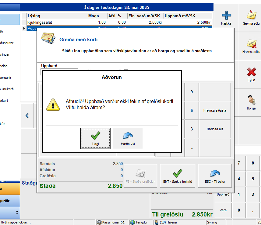 Þá kemur þessi aðvörun, við ýtum á í lagi, því þarna vitum við og erum búin að athuga þar að kortagreiðslan fór í gegn í síma viðskiptavinar.