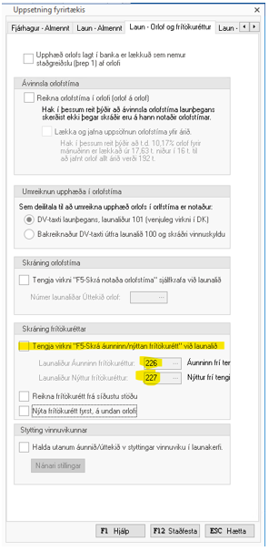 Í flipanum: Laun- Orlof og frítökuréttur undir: Laun > Uppsetning > Almennar stillingar er hægt að haka við „Tengja virkni F5 skrá áunnin/nýttan frítökurétt við launalið“. Þá er hægt að auðkenna launaliði sem eru fráteknir fyrir frítökurétt. Að sjálfsögðu þarf að stofna þessa launaliði fyrst í: Laun > Launauppsetning > Launaliðir > Almennir launaliðir.