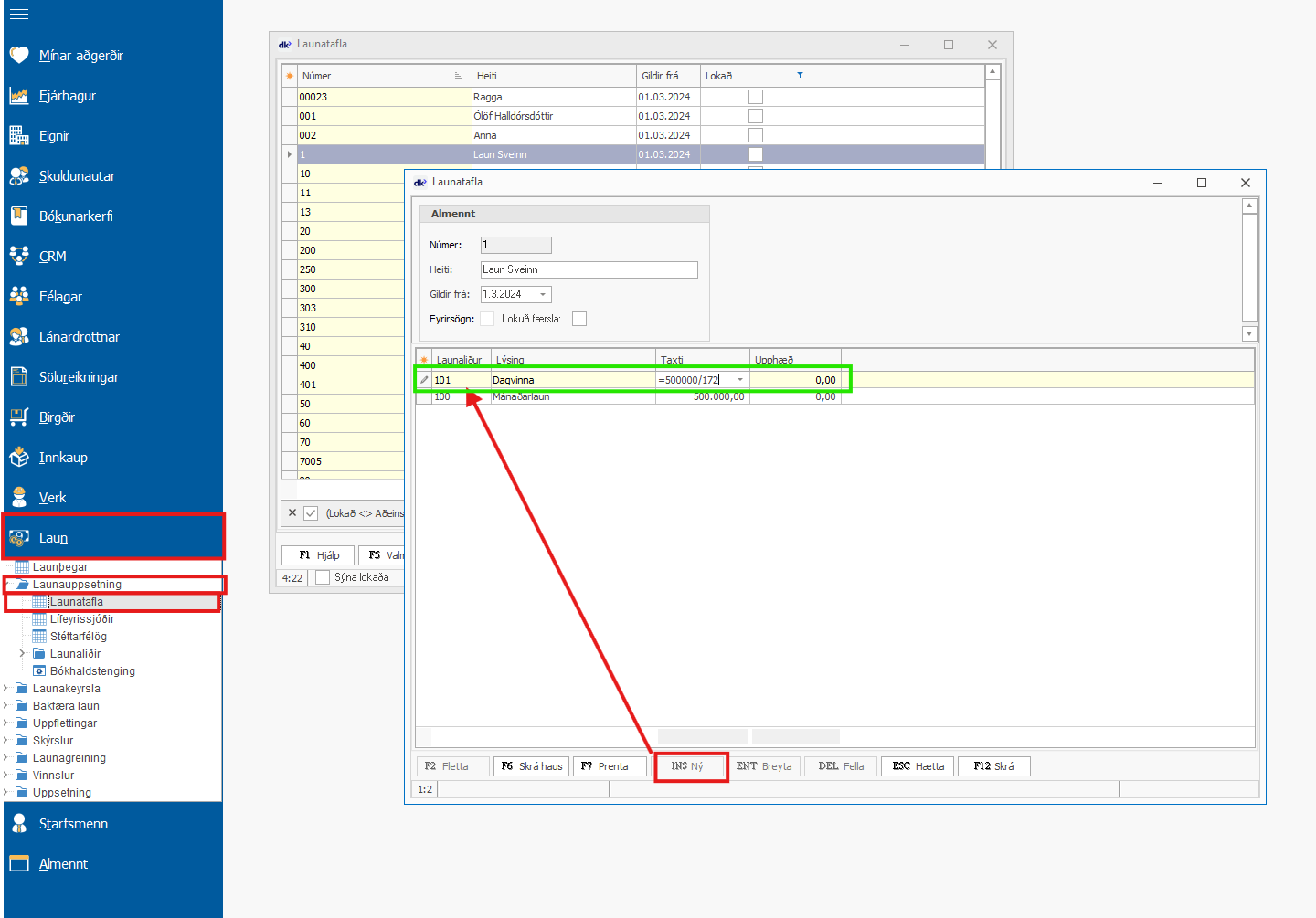 Farið er í Laun - Launauppsetning - Launatafla og launatafla starfsmannsins valin - Ýtt er á INS Ný og dagvinnulínu bætt við.