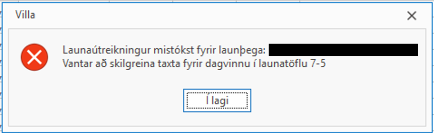 Ef þú færð villuna "Launaútreikningur mistökst fyrir launþega: (). Vantar að skilgreina taxta fyrir dagvinnu í launatöflu ()" þá þarf að bæta inn dagvinnutaxta í launatöflu launþegans.