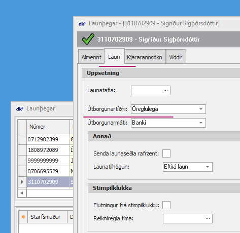 Ef þarf að breyta stillingum á mörgum launþegum er hægt að opna þann efsta, breyta í "Óreglulega" og opna svo næsta launspjald með flýtileiðinni "F4". Þegar búið er að breyta stillingum hjá öllum, er síðan ýtt á F12 eða staðfesta í lokin.