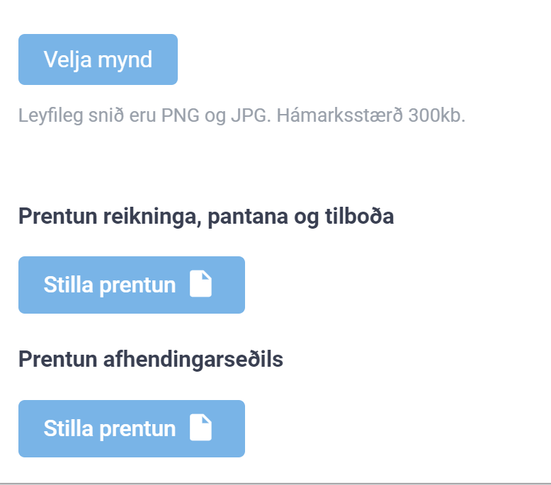Notandi getur sett inn mynd fyrir logo fyrirtækis sem birtist á sölureikningi, sölupöntun og sölutilboði.