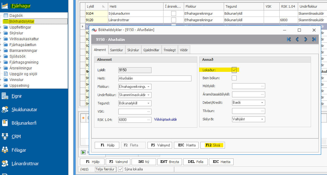Loka bókhaldstímabili Hægt er að loka bókhaldstímabilum sem ekki á að vera hægt að færa á. Almennt > Bókhaldstímabil > Tvísmellir á bókhaldstímabilið > Hakar við "Tímabili lokað" > F12 Skrá Einnig er hægt að loka ákeðnum mánuðum. Ef hakað er í mánuði ...