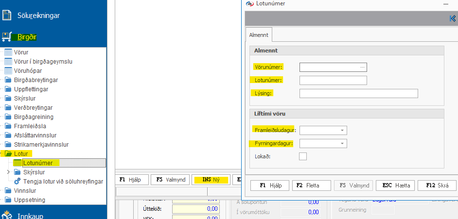 Birgðir > Lotur > Lotunúmer > INS Ný, þar er valið vörunúmer, lotunúmer, sett inn lýsingu, framleiðslu og fyrningardag.