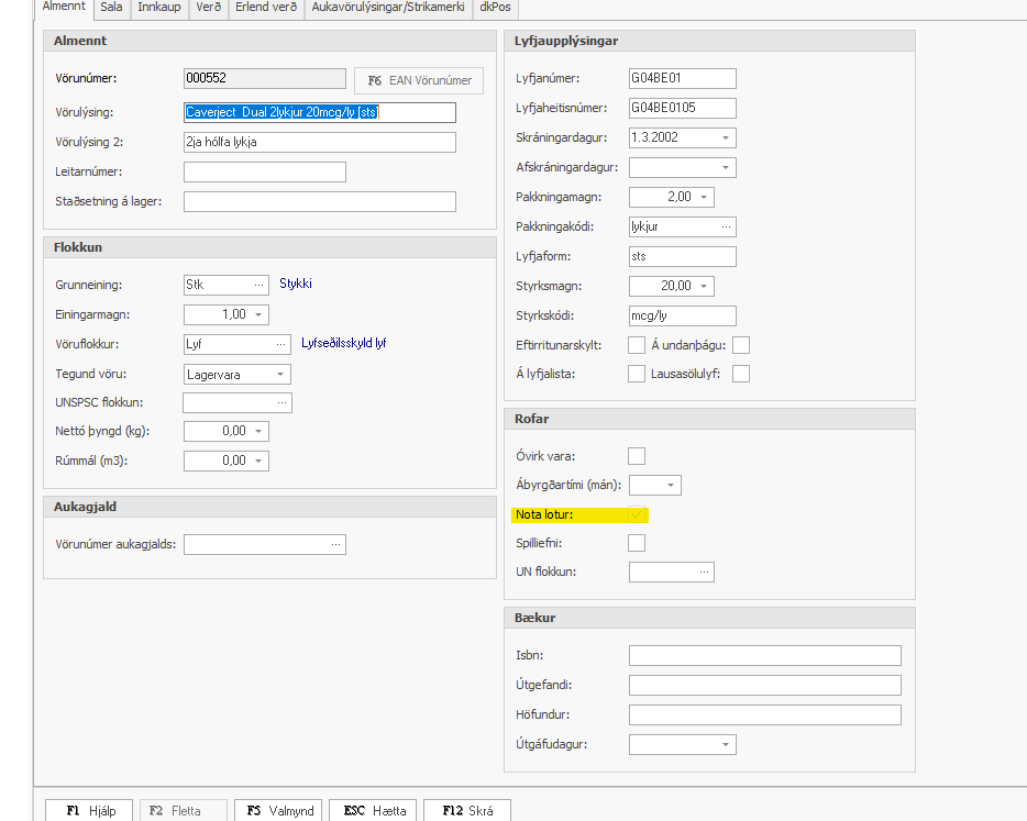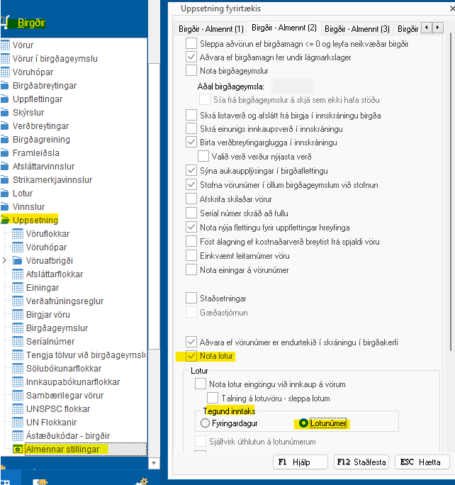 Birgðir > Uppsetning > Almennar stillingar > Birgðir - Almennt (2) > Haka í "Nota lotur" og haka í "Lotunúmer"