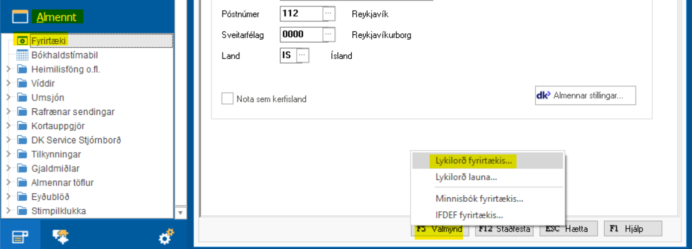 Almennt > Fyrirtæki > F5 Valmynd > Lykilorð fyrirtækis