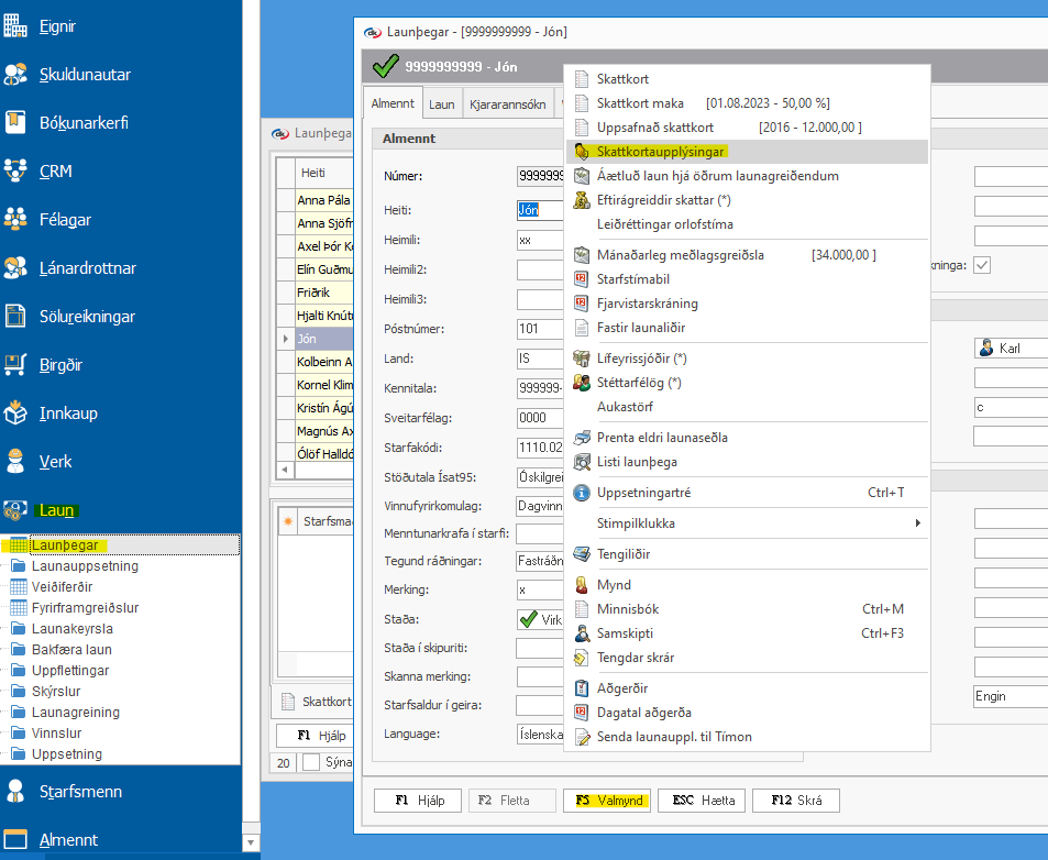 Laun > Launþegar > Tvísmellir á launþegann > F5 Valmynd > Skattkortaupplýsingar