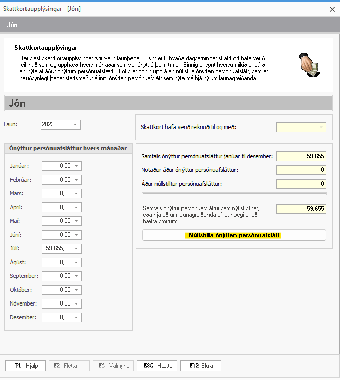 Stundum ef óvart hefur verið reiknuð laun fyrir allt árið en launþeginn átti bara að fá seinasta mánuð, þá getur þurft að handvirkt breyta úr fullum ónýttum persónuafslætti og setja 0 í reitina og ýta svo á F12.