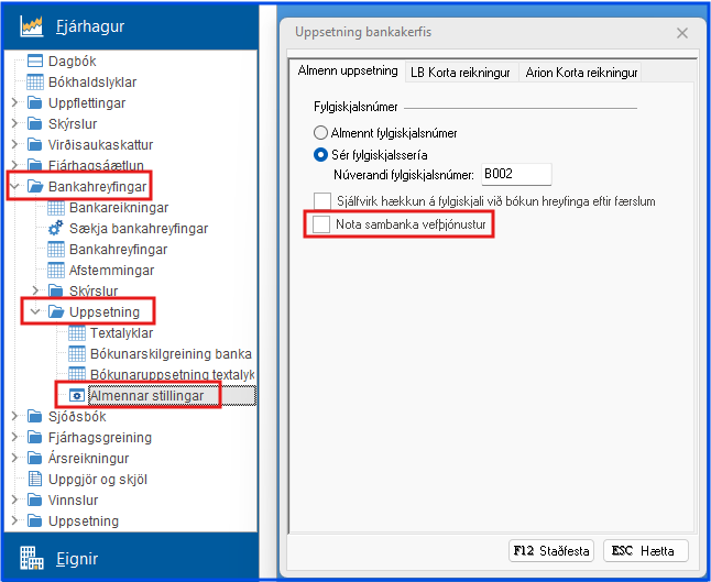 - Einnig þarf að vera hakað við Nota sambankavefþjónustur í stillingum undir Fjárhagur → Bankareikningar → Uppsetning → Almennar stillingar.