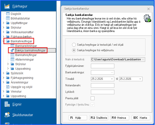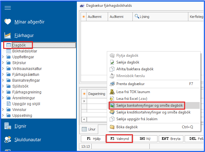 - Dagbók > F5 Valmynd > Sækja bankahreyfingar og smíða dagbók