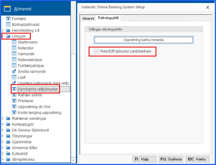 - Hægt er að nota Sambankavefþjónustur til að sækja frá Landsbankanum en þá þarf að fara í Almennt → Umsjón → Sambankavefþjónustur, opna flipann Reikningsyfirlit og setja hak við Nota B2B þjónustur Landsbankans.