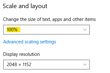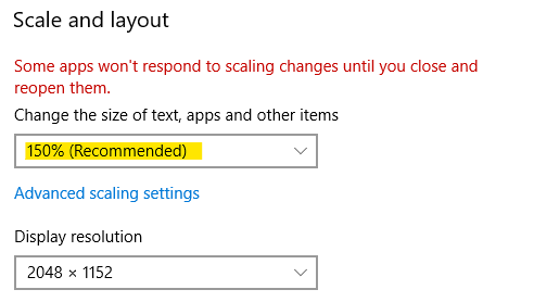 Hér er dæmi um 150% stillingu á skjá með upplausnina 2048x1152 punkta. Ef pdf-skjöl þjappast saman á skjá með þessum stillingum, þarf að breyta (tímabundið) aðdrættinum í 100% og keyra svo pdf-smíðina, eða færa hýsingargluggann (eða forritið fyrir þá sem eru ekki í hýsingu hjá dk) yfir á skjá sem er með 100% aðdrátt stilltann.