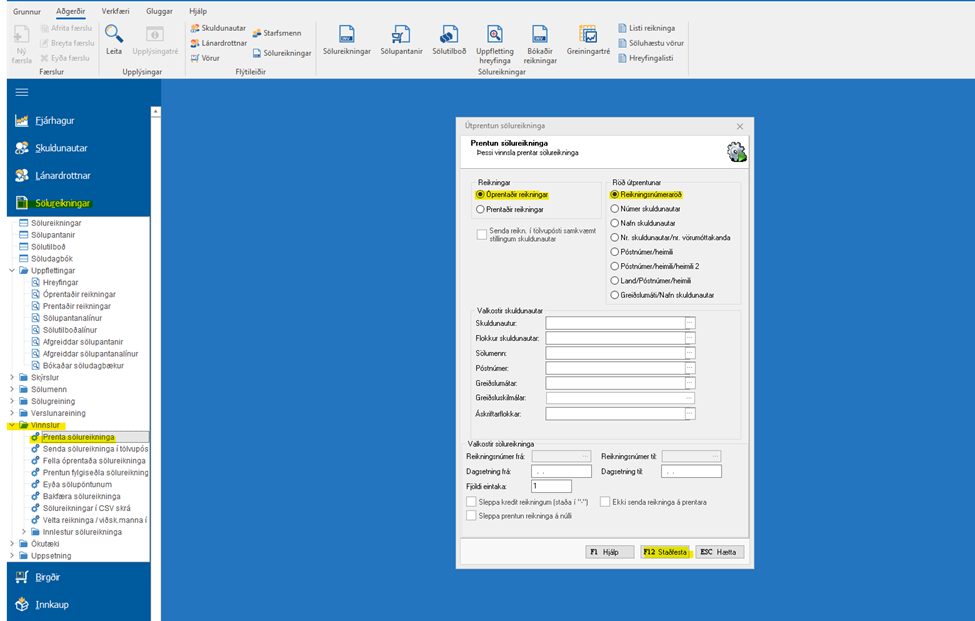 Sölureikningar> Vinnslur> Prenta sölureikningar> F12 staðfesta