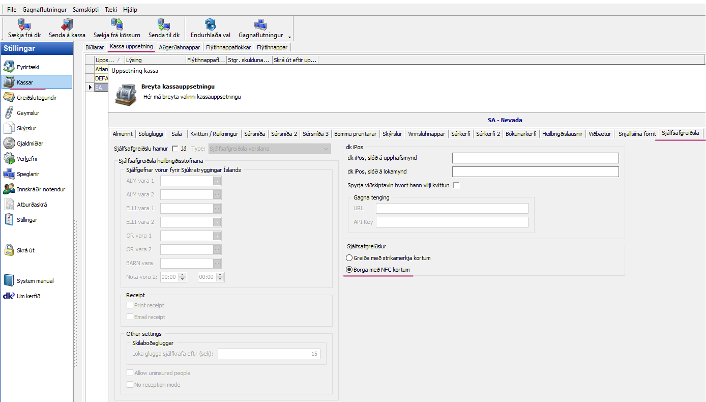Stillingar - Kassar - Kassa uppsetning - Sjálfsafgreiðslu flipinn