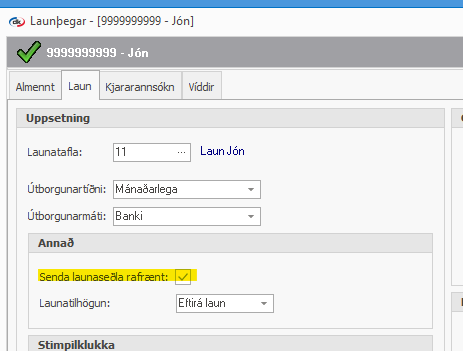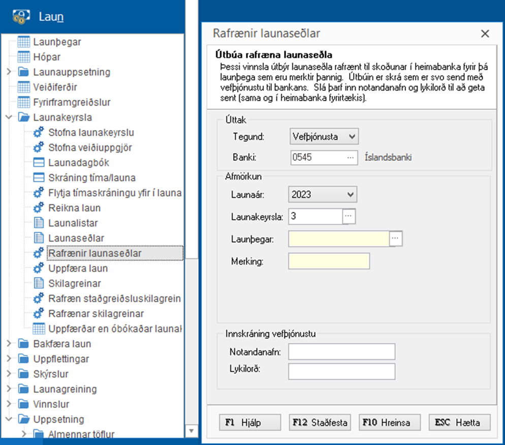 Ef fyrirtækið er með sambankavefþjónustu þá er hægt að senda launaseðla með Tegund: Vefþjónustu. Setja þarf inn rétt bankanúmer, launaár og númer þeirrar launakeyrslu sem við á. Setja þarf inn notendanafn og lykilorð og í lokin F12 Staðfesta